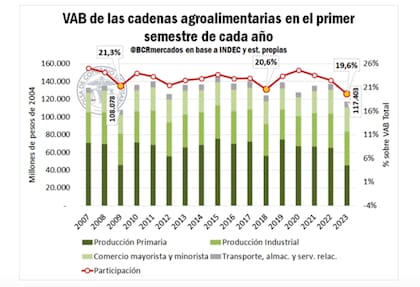 En base a esos números del organismo, se estima que el VAB de las cadenas agroalimentarias en el primer semestre alcanzó $117.403 millones, registrando una caída del 14%, respecto de igual período de 2022.