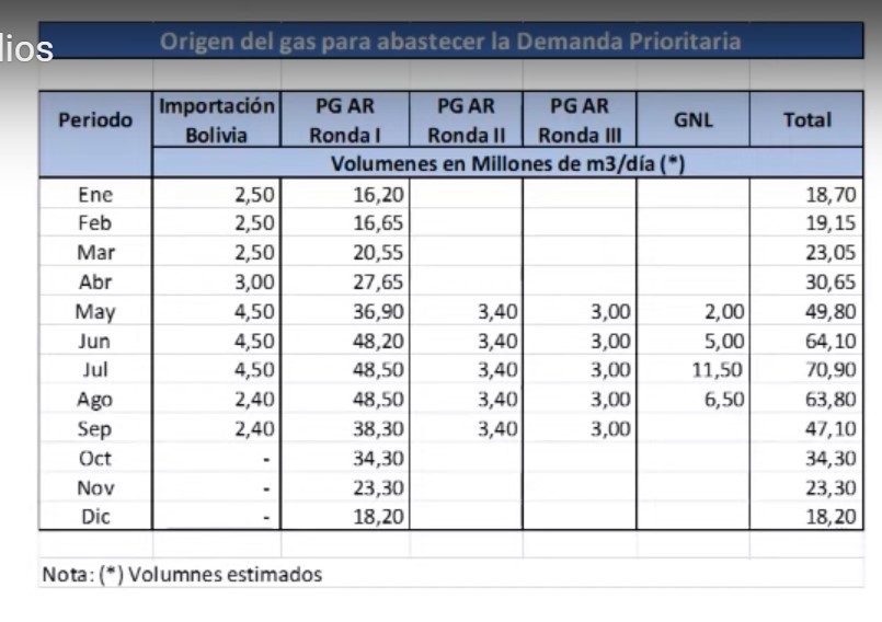 Solanet presentó un archivo sobre las estimaciones del sistema de gas del país para este año. En el mismo, se señala tanto el gas proveniente de la producción nacional por medio del Plan Gas.Ar, pero también las importaciones previstas de GNL (gas natural licuado) por barco y las de Bolivia.