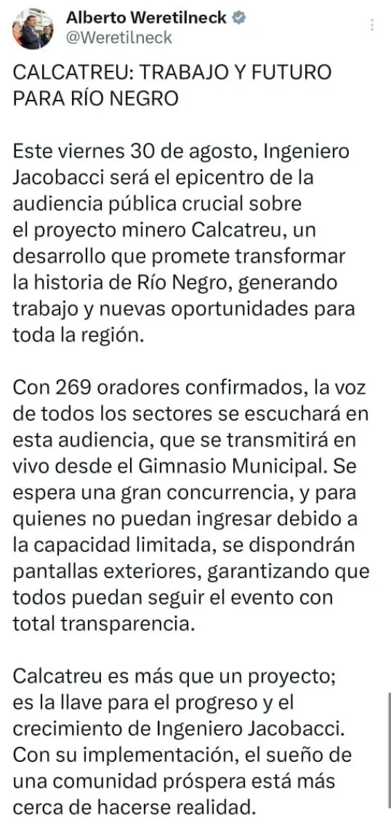 A días de la esperada audiencia pública que debatirá un proyecto clave para Jacobacci y la región, el gobernador Alberto Weretilneck se expresó a través de la red social X. Allí calificó al encuentro como “crucial” respecto del proyecto minero Calcatreu, “un desarrollo que promete transformar la historia de Río Negro, generando trabajo y nuevas oportunidades para toda la región”.