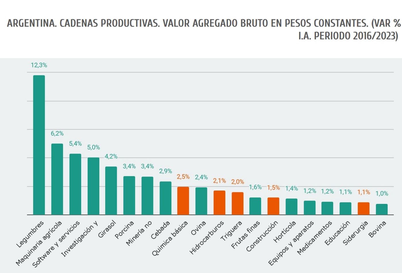 El informe refleja que en el total nacional, las cadenas que mejor desempeño han tenido en el periodo 2016 – 2023 fueron las de las legumbres, la maquinaria agrícola, el software y los servicios informáticos, la investigación y el desarrollo y el girasol.