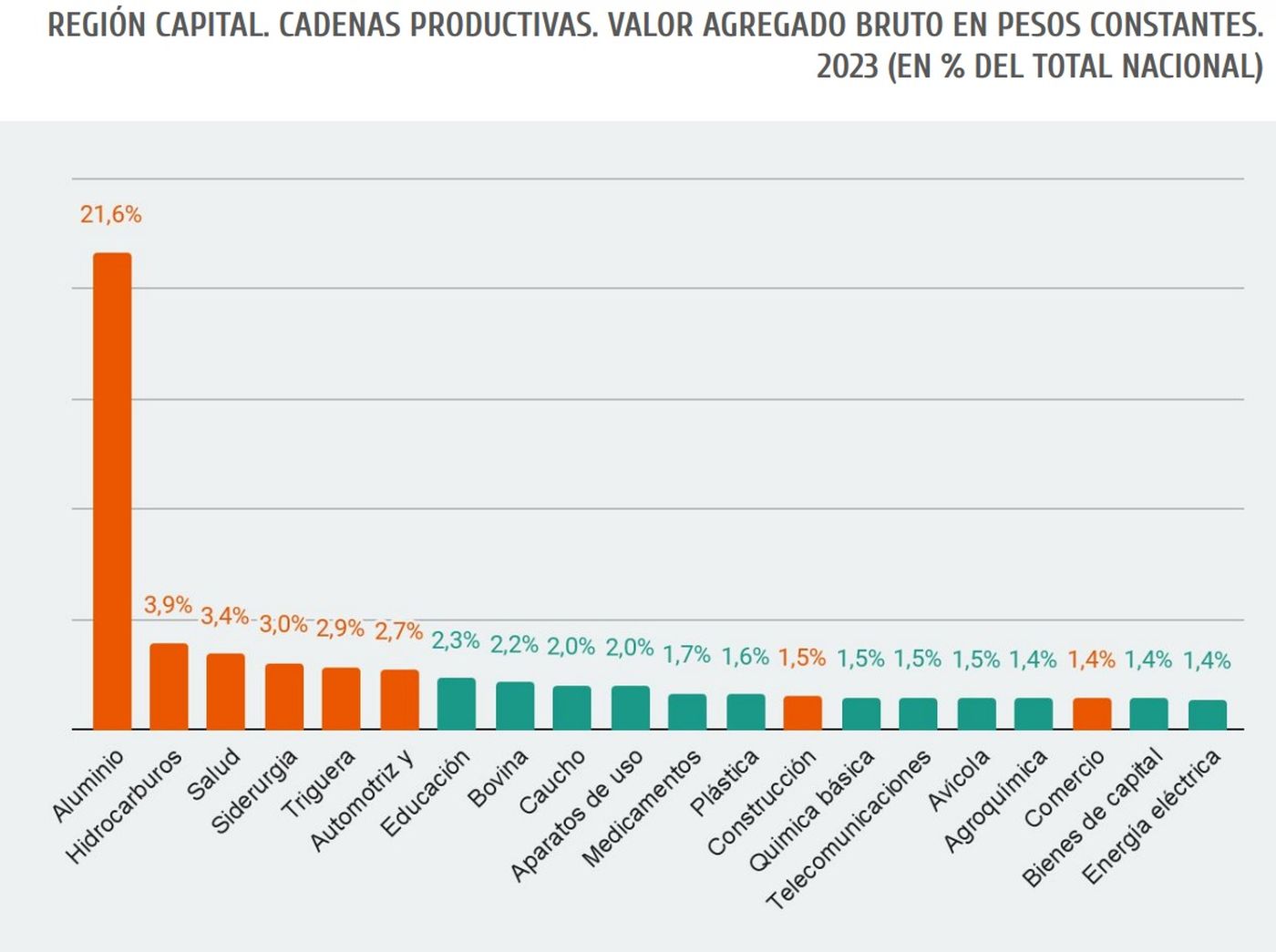 Y al cruzar el contexto nacional con el regional, se evalúa La Plata, Berisso y Ensenada realiza su principal aporte a la composición de la actividad nacional en la cadena del aluminio, en la que es la principal productora. Y en menor medida lo hace en los hidrocarburos, la salud, la siderurgia, la triguera, la automotriz y la educación.