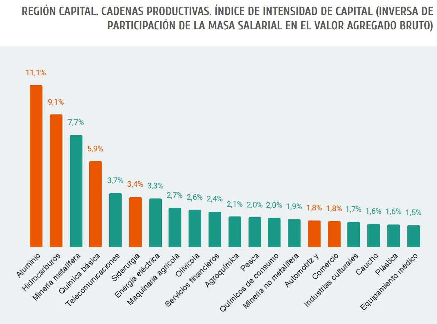 Finalmente, para terminar de definir las actividades con mayor potencial, el estudio analiza la combinación de factores productivos para detectar las actividades que en la región mayor proporción de capital requieren en su proceso productivo, y allí vuelven a aparece el aluminio, los hidrocarburos, la minería, la metalífera y la química básica.