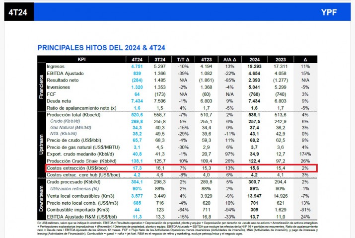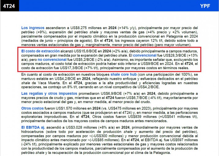 El último balance presentado por la YPF libertaria respecto de los indicadores del 2024 muestra claramente las conquistas obtenidas en materia de costos de producción y la perspectiva hacia adelante como meta para reducir la incidencia de los pozos convencionales.