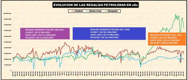 A lo largo de los últimos 20 años las regalías petroleras al interior de la Cuenca del Golfo San Jorge y la provincia de Neuquén no solamente estaban equilibradas, sino que Chubut lideraba con mayores ingresos como consecuencia de los mayores niveles de producción petrolera.