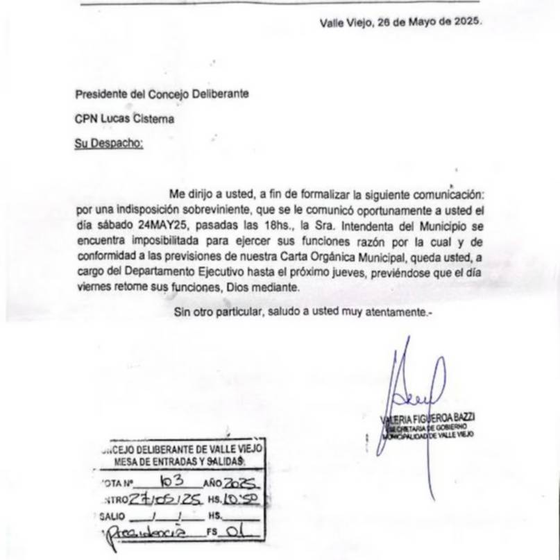 En efecto, se conoció una nota firmada por una colaboradora de la intendenta Zenteno, en la que notifican al concejal Cisternas que debía hacerse cargo del Ejecutivo municipal debido a una “indisposición sobreviniente”. Allí se le indica al edil que debía ejercer tales funciones hasta este jueves.