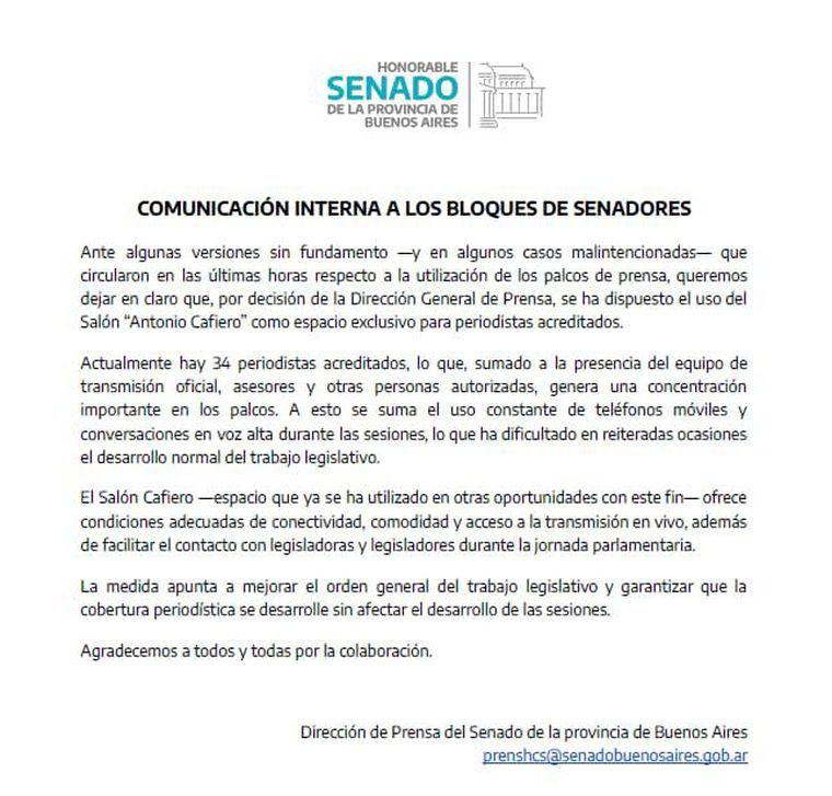 Ante esta situación el Senado bonaerense, emitió un comunicado negando las restricciones a los periodistas acreditados. Afirmando que eran “versiones sin fundamento y en algunos casos malintencionadas”, manifestando que se dispuso el salón Antonio Cafiero para la cobertura periodísticas de las sesiones.