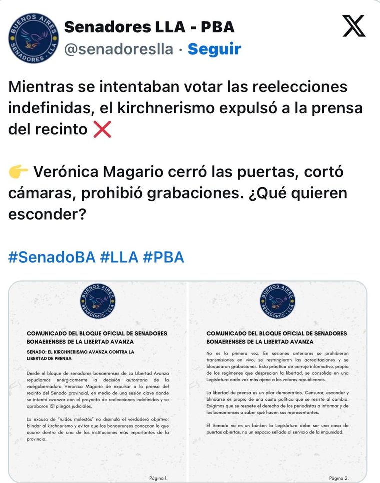 Los presidentes de tres de los bloques opositores; el PRO, UCR Cambio Federal y La Libertad Avanza al enterarse, la semana pasada, de la prohibición a los periodistas a acceder al palco de prensa a realizar la cobertura de las sesiones; pidieron a la vicegobernadora y titular del Senado bonaerense, Verónica Magario, que “revea esta situación” y que deje entrar a los trabajadores de prensa al palco debido a que las repercusiones podrían ser de mayor escala.