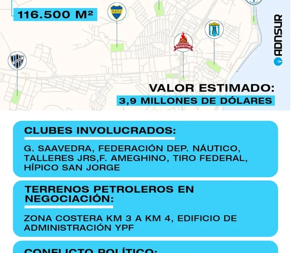 De acuerdo con Adnsur. Un acuerdo firmado en octubre de 2022 por el entonces intendente Juan Pablo Luque y la empresa YPF, que era presidida por el santacruceño Pablo González, contemplaba la Municipalidad pudiera acceder a la titularidad de ciertos terrenos «que le permitan generar espacios para usos urbanos y para el desarrollo de clubes sociales”.