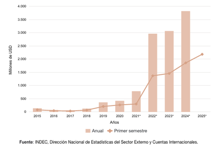 Se registró una suba de 15,6% respecto al primer semestre de 2024. Los principales países de destino fueron Estados Unidos, con 32,8%; Chile, con 24,9%; Suiza, con 7,2%; y Brasil, con 6,6%.