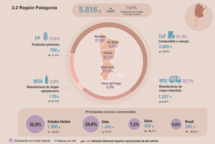 Las ventas al exterior, en orden descendente con respecto a la contribución regional, procedieron de las provincias del Neuquén, 37,6%; Chubut, 30,1%; Santa Cruz, 21,5%; Río Negro, 6,4%; y Tierra del Fuego, Antártida e Islas del Atlántico Sur, 4,5%.