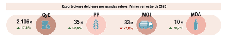Al considerar las exportaciones de esta región, la categoría grandes rubros Combustibles y Energía (CyE) , con un total de USD 3.569 millones, representó el 61,4% del total, lo que significó un aumento de 19,9% con respecto al mismo período del año anterior. Las Manufacturas de Origen Industrial (MOI) sumaron USD 1.287 millones, representaron 22,1% del total, y aumentaron 6,8% con respecto al primer semestre de 2024. Por su parte, los PP sumaron USD 789 millones, 13,6% del total exportado, y tuvieron un crecimiento de 11,4% en relación con igual período de año anterior. Por último, las Manufacturas de Origen Agropecuario (MOA) con USD 170 millones, representaron el 2,9% de lo exportado, y registraron un aumento de 21,9% interanual.