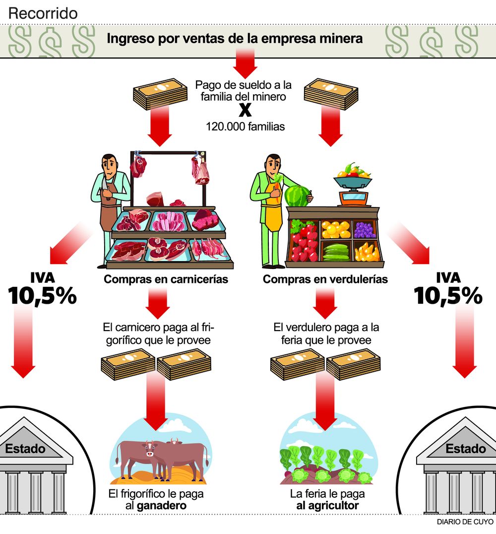 De esta manera se demuestra que la riqueza, el dinero que ingresa por la Minería y paga los sueldos, circula de tal manera que beneficia a la Ganadería, a la Agricultura y al Estado. Y hay que agregar que cada uno de estos destinatarios usa el mismo dinero para solventar sus propias necesidades.