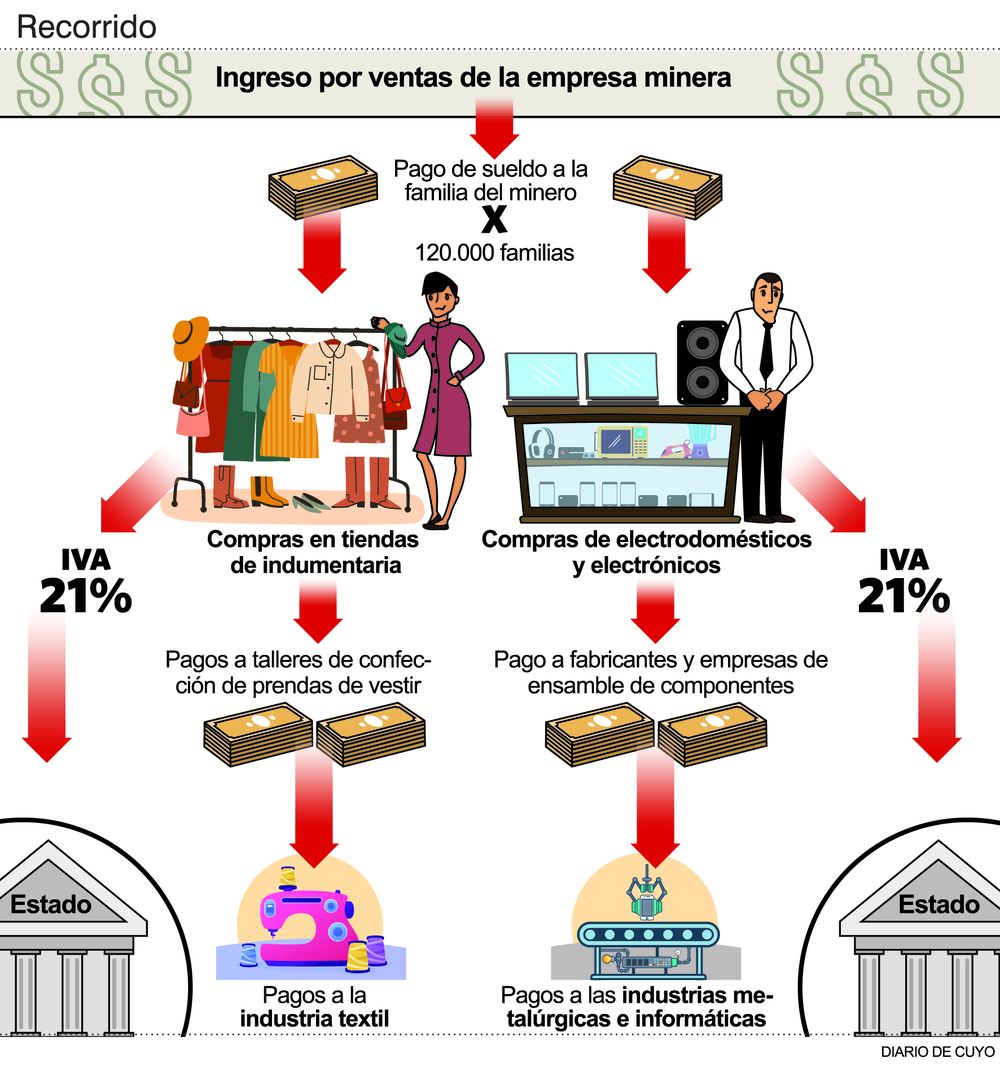 En fin, podríamos desarrollar cientos de ejemplos pero con los que elegimos para mostrar cómo circula el dinero de los salarios creemos haber explicado, de manera muy elemental tal vez, de qué manera la riqueza que produce la actividad minera genera un verdadero efecto multiplicador de la economía, beneficiando a la sociedad, a las demás actividades productivas y comerciales, y aportando a las arcas del Estado