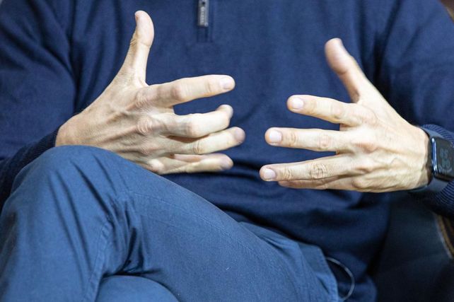 Recibe a La Capital en un despacho que no es el propio, pero igualmente se lo ve instalado. Revisa unos datos del día de seguridad en una tablet y pide dos cortados. Atrás de él hay una tapa de un diario de cuando fue electo gobernador en 2023 y una colgada de Unidos festejando un triunfo electoral, posiblemente, sea el del mismo día.