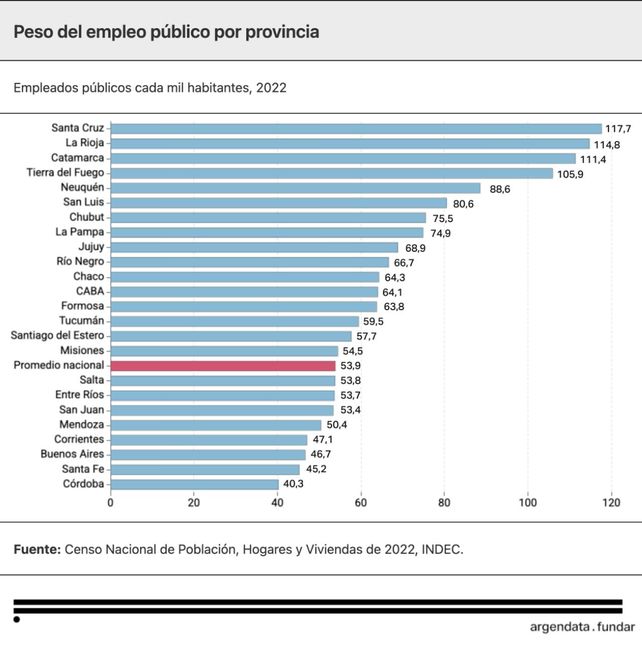 En el otro extremo de la tabla: Santa Cruz con 117,7 empleados públicos cada 1.000 habitantes; La Rioja con 114,8; Catamarca con 111,4; y Tierra del Fuego con 106. Estas cuatro provincias, junto a La Pampa, son las menos pobladas del país.
