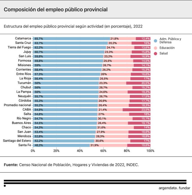 La composición del empleo público varía según la provincia. En Santa Fe, o provincias con mayor población, el peso de la administración pública es menor, por eso la mayoría de los trabajadores están destinados a educación, docentes y no docentes, y salud, médicos, enfermeros y personal de apoyo.