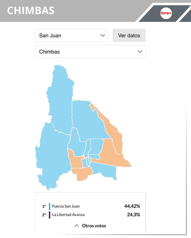 -Chimbas: la intendencia la tiene el peronismo, con Daniela Rodríguez al frente. El peronismo quedó en primer lugar, con 44,42% (22.641 votos); la segunda posición fue para La Libertad Avanza con el 24,30% (12.386 votos) y cerró Por San Juan con el 23,72% (12.088 votos).