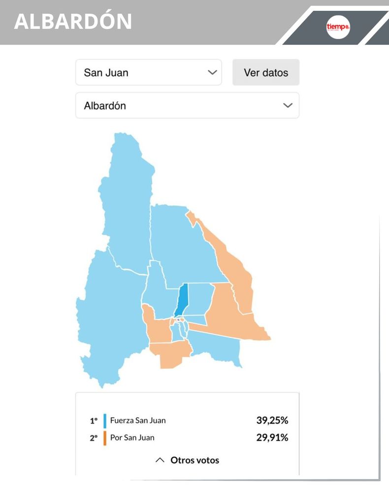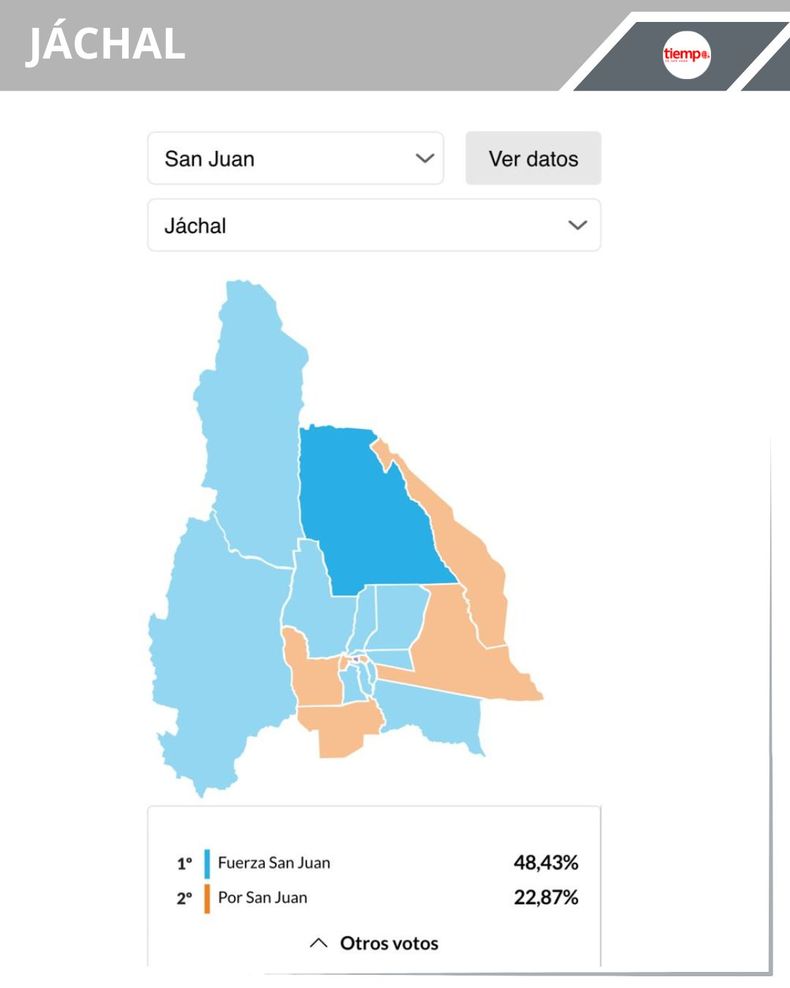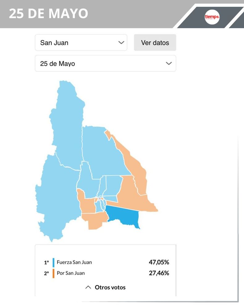 -25 de Mayo: en el departamento a cargo del peronista Rodolfo Jalife, Fuerza San Juan ganó con el 47,05% (4.630 votos), en segundo lugar quedó Por San Juan con el 27,46% (2.702 votos) y La Libertad Avanza se quedó con el 18,40% (1.811 votos)