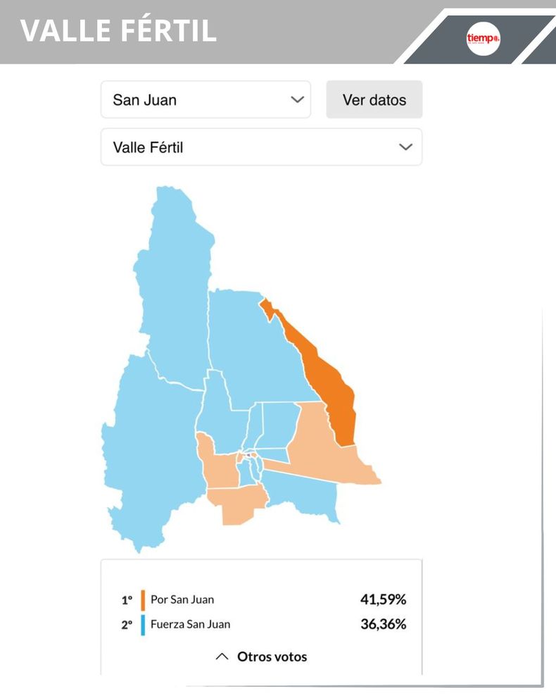 -Valle Fértil: en el municipio que está a cargo del peronista Mario Riveros quedó en primer ligar Fuerza San Juan con 53,27% (1.951 votos), en segundo lugar Por San Juan con 26,87% (984) y en tercer lugar, La Libertad Avanza con 14,60% (535 votos).