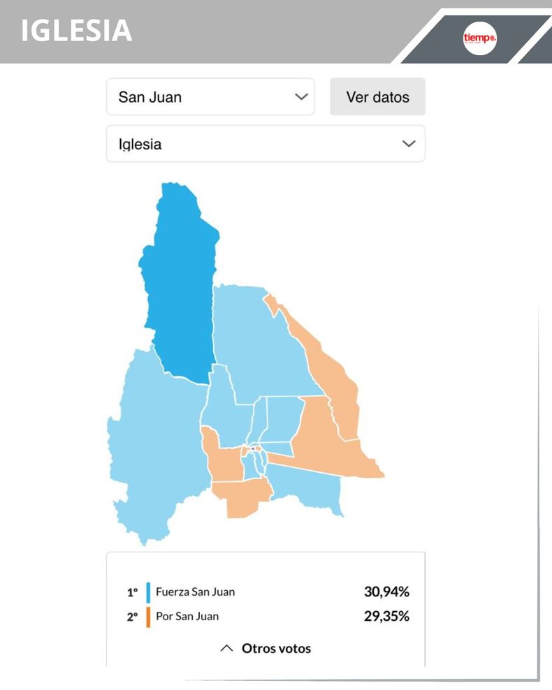 -Iglesia: la intendencia es ejercida por Jorge Espejo, del bloquismo -en alianza con el oficialismo provincial-. En primer lugar quedó Fuerza San Juan, con el 30,94% (1.466 votos); el segundo lugar fue para Por San Juan con el 29,35% (1.391 votos) y cerró La Libertad Avanza con el 27,12% (1.285 votos).