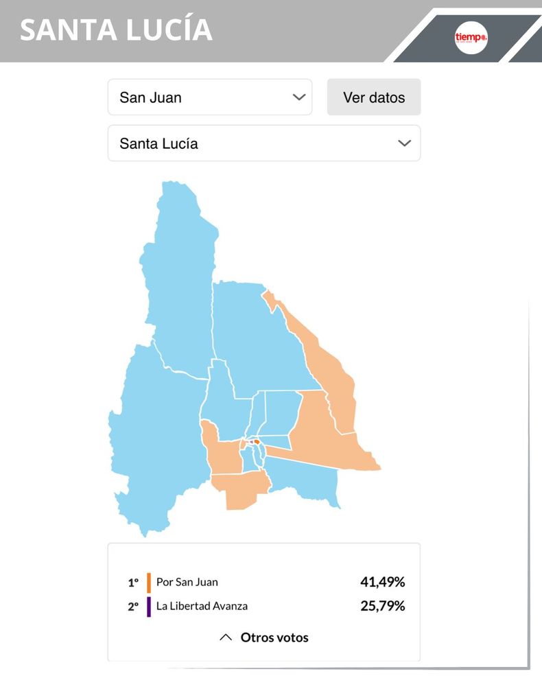 -Santa Lucía: en el departamento comandado por Juan José Orrego, hermano del gobernador Marcelo Orrego, Por San Juan se quedó con 41,49% (13.239 votos), La Libertad Avanza se quedó con 25,79% (8.229 votos) y Fuerza San Juan obtuve 25,47% (8.127 votos).