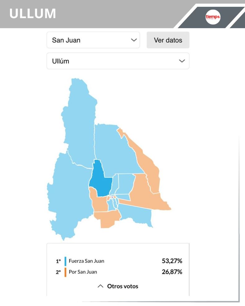 -Ullum: en el departamento a cargo del justicialista David Domínguez, Fuerza San Juan quedó en primer lugar con 53,27% (1.951 votos), en segundo lugar se ubicó Por San Juan con 26,87% (984) y en tercer puesto quedó La Libertad Avanza con 14,60% (535).