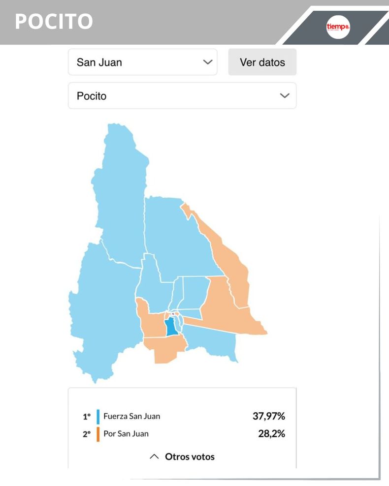 -Pocito: la intendencia le ejerce el peronismo, con Fabián Aballay. El primer lugar fue para Fuerza San Juan con el 38,20% (13.539 votos); en segundo lugar quedó Por San Juan con el 27,99% (9.920 votos) y el tercer lugar fue para La Libertad Avanza con el 25,49% (9.034 votos).