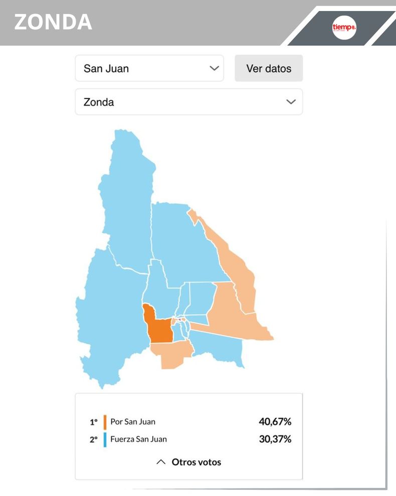 -Zonda: en el departamento a cargo del integrante del bloquismo Juan Atámpiz quedó en primer lugar Por San Juan con 40,67% (1.405), en segundo lugar Fuerza San Juan con 30,37% (1.049 votos) y en el tercer puesto se ubicó La Libertad Avanza con 22,61% (781 votos).