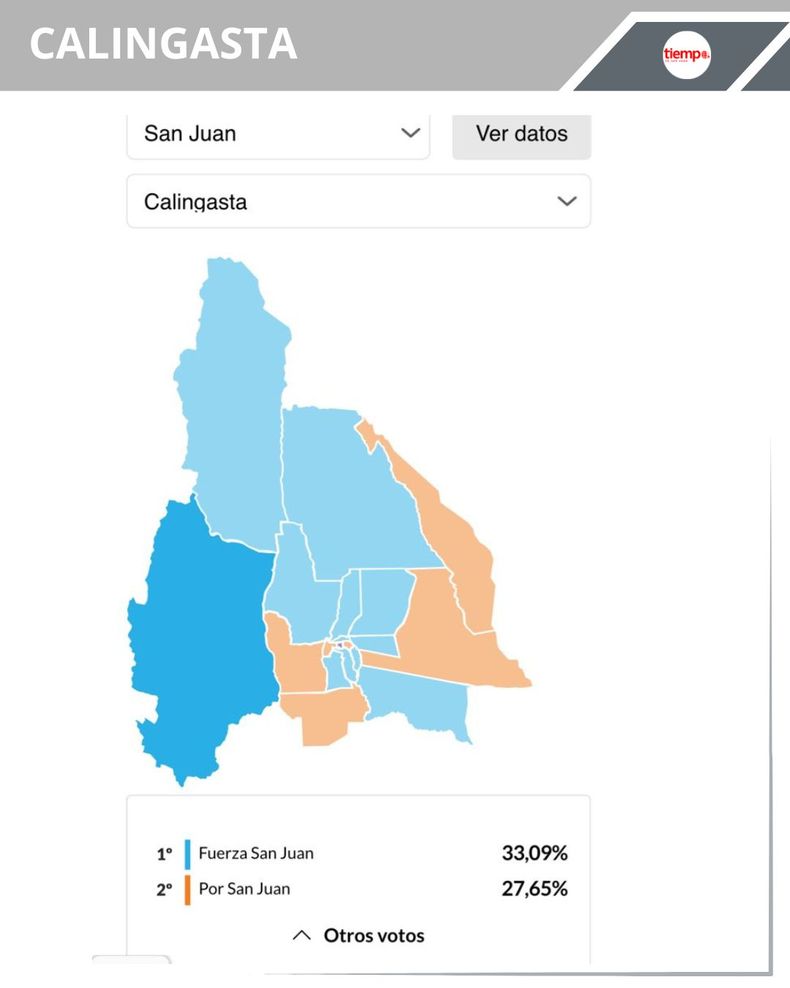 -Calingasta: la intendencia la tiene el peronismo, con Sebastián Carbajal en el sillón máximo municipal. Allí se impuso Fuerza San Juan con el 33,09% (1.990 votos), Por San Juan quedó segundo con el 27,65% (1.663 votos) y cerró La Libertad Avanza con el 27,64% (1.662 votos).