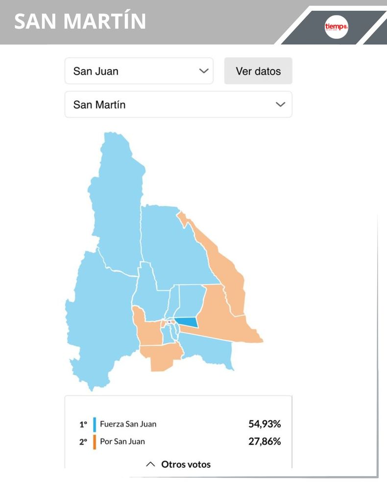 -San Martín: en la tierra de origen del ganador de la contienda Cristian Andino y cuya intendenta es Analía Becerra, Fuerza San Juan obtuvo 54,93% (4.059 votos), Por San Juan obtuvo 27,86% (2.059 votos) y La Libertad Avanza 11,89% (879 votos).