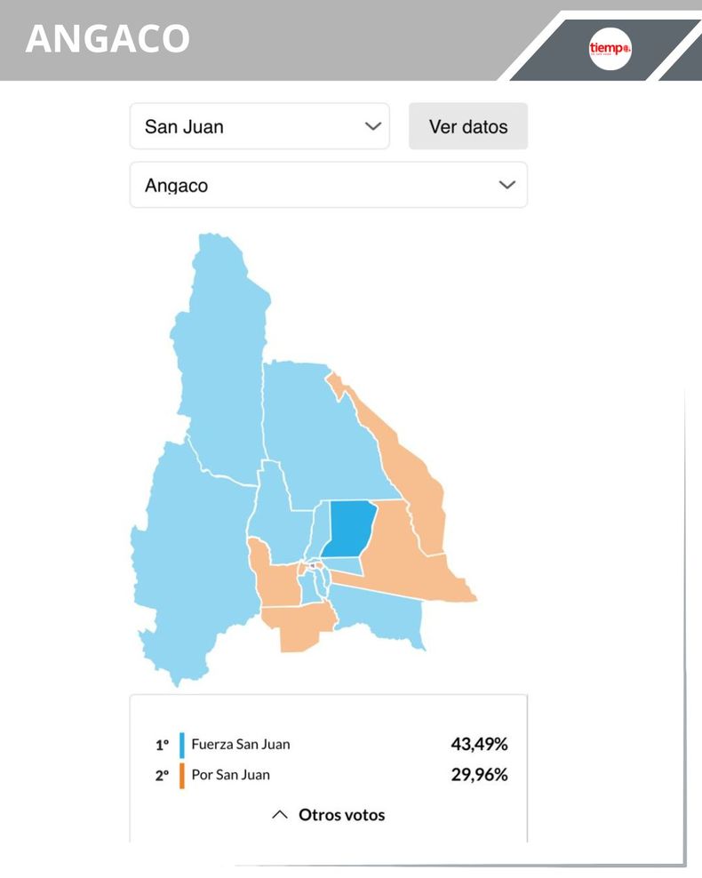 -Angaco: la intendencia está en manos de José Castro, del peronismo, que lleva tres períodos al frente del municipio. El peronismo ganó con el 43,49% (2.896 votos), quedó segundo el frente Por San Juan con el 29,96% (1.995 votos) y en tercer lugar, cerró La Libertad Avanza con el 17,73% (1.181 votos).