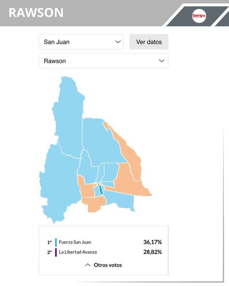 -Rawson: el municipio que está bajo la órbita del referente del PJ, Carlos Munisaga, e frente Fuerza San Juan se quedó con el 36.17% (25.185 votos), en segundo lugar se ubicó La Libertad Avanza con el 28,82% (20.068 votos) y en tercer puesto quedó Por San Juan con 25,86% (8.005 votos).