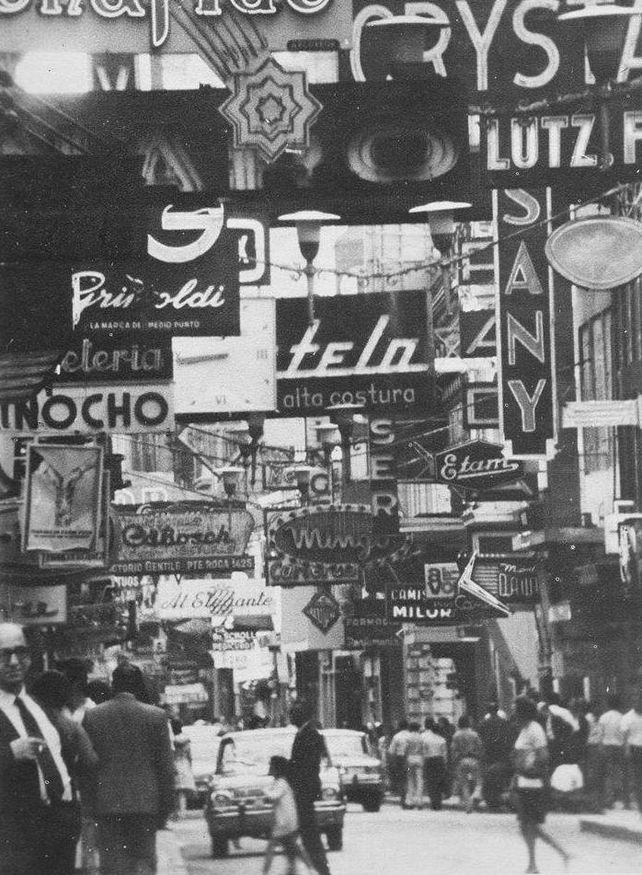 La peatonal Córdoba en 1977 brillaba con sus carteles que pregonaban una mezcla de marcas y locales. Foto: @rosario_de_antes
