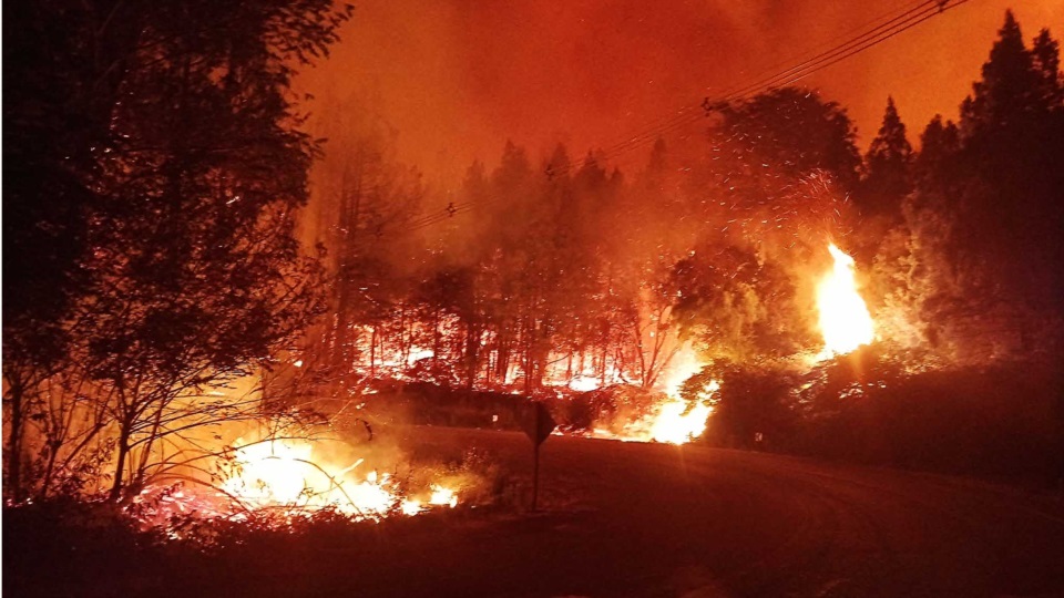 Imágenes y videos del lugar, muestran como gigantescas llamaradas, más altas que un pino, avanzan arrasando todo el bosque.