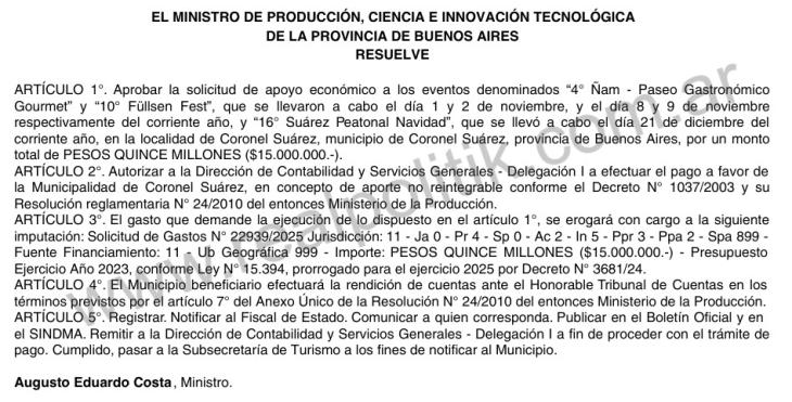 La situación surge a partir de la resolución Nro. 523-MPCEITGP-2025, firmada por el gobernador Axel Kicillof el 29 de diciembre de 2025, mediante la cual se otorgó un “apoyo económico” de 15 millones de pesos a la municipalidad de Coronel Suárez para la realización de dos eventos culturales y gastronómicos. El problema es que, para ese entonces, los eventos ya habían concluido.