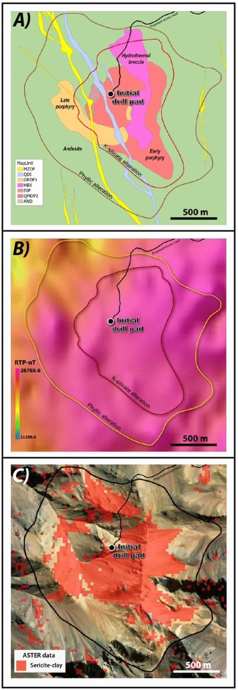 - Características técnicas: sistema de pórfido Cu–Au–Mo, vetas de stockwork de cuarzo, alteración potásica y anomalía magnética de 1.000 m de profundidad.