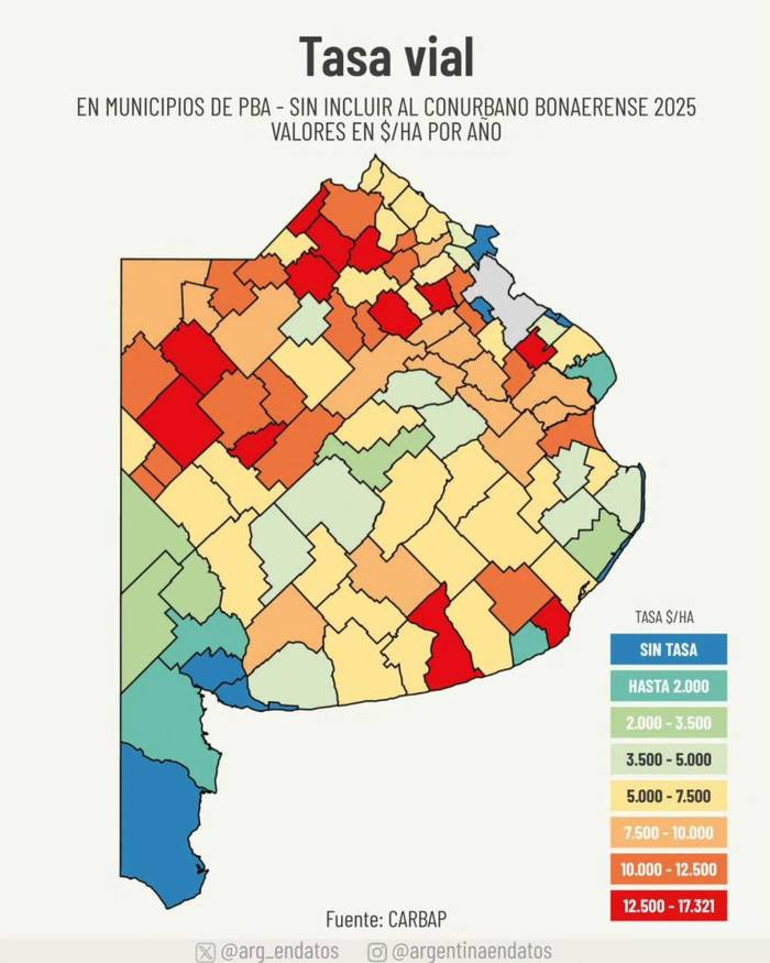 En el informe de Carbap se expresa que la Tasa Vial “tiene como objetivo mantener 120.000 kilómetros de caminos rurales, pero registra irregularidades, como un servicio deficiente y tasas atadas al valor de granos y carne, entre otras”. También se afirma que Chivilcoy, Colón y Necochea se encuentran “entre los municipios con las tasas más altas”.