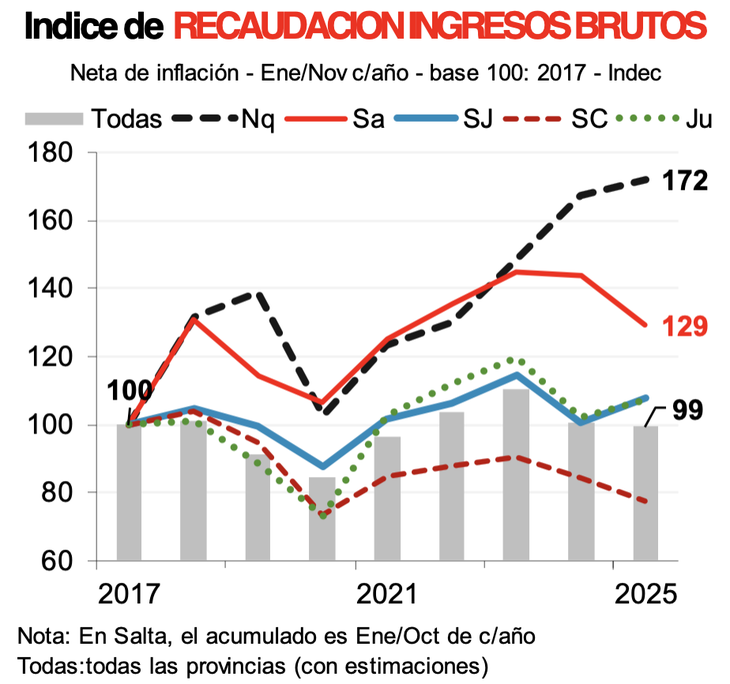 En Salta, la mejora fue más moderada, mientras que en San Juan, Santa Cruz y Jujuy, la recaudación presenta una evolución más acotada e incluso estancada en los últimos años.