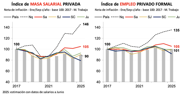 Según el informe al que accedió Energy Report, desde la salida de la pandemia, Neuquén registra un crecimiento sostenido del empleo privado formal y de la masa salarial real, muy por encima del promedio nacional. En contraste, en las provincias mineras del norte y oeste del país, el empleo privado se ha mantenido estable o incluso ha retrocedido, y la masa salarial no muestra mejoras significativas en términos reales.