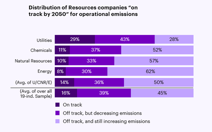 El estudio, que abarca a empresas de petróleo, gas, energía eléctrica e industria pesada del G2000, muestra que solo el 14% de estas compañías está en camino de alcanzar la carbono neutralidad operativa hacia 2050, una caída frente al 18% registrado el año pasado. En el segmento de Recursos Naturales, el panorama es igual de desafiante: apenas el 14% cumpliría las metas de reducción de emisiones, mientras que un 57% no solo no avanza, sino que directamente está incrementando sus emisiones.
