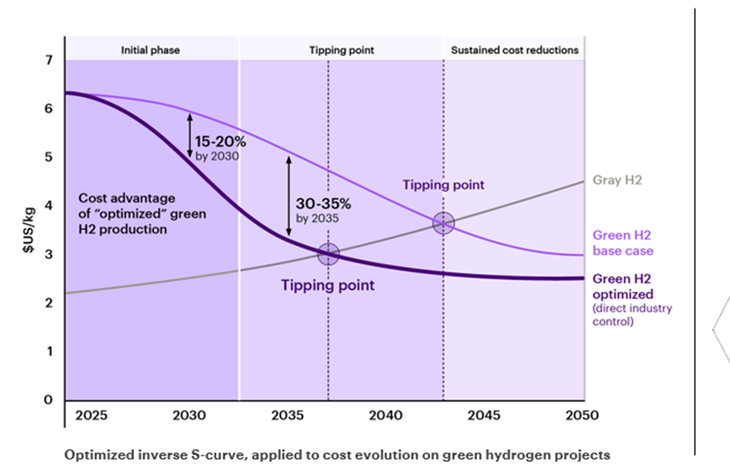La consultora modeló este esquema en la producción de hidrógeno verde y concluyó que los costos podrían caer un 30% más rápido que con el enfoque tradicional. Incluso, el ahorro podría alcanzar el 35% hacia 2035 y la paridad de precios con el hidrógeno gris llegaría en 2037, seis años antes que bajo una lógica proyecto por proyecto.