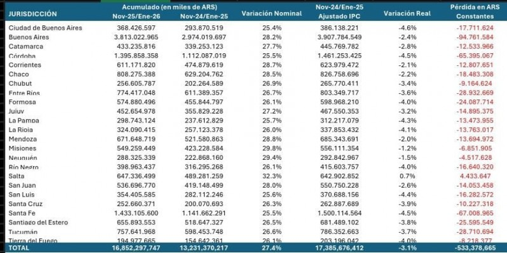 Si bien todas las jurisdicciones mostraron incrementos nominales de entre el 25% y el 33%, al actualizar los montos por inflación, 23 de las 24 provincias registraron pérdidas reales. Las más perjudicadas fueron Córdoba y Santa Fe, que en conjunto dejaron de percibir más de 130 mil millones de pesos. La Ciudad Autónoma de Buenos Aires también sufrió una caída real del 4,6%.