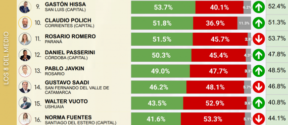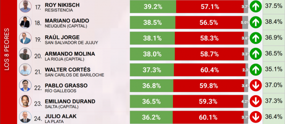 El intendente peor valorado es Julio Alak, de La Plata, y sus números son prácticamente inversos a los de Stevanato: 60,1% de desaprobación y solo 36,2% de imagen positiva. Le siguen, de abajo hacia arriba, Emiliano Durand (Salta capital) y Pablo Grasso (Río Gallegos).