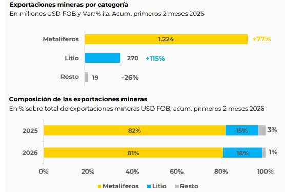 En el primer bimestre de 2026, las ventas de litio al exterior llegaron a USD 270 millones (+115,5% interanual), representando el 17,8% del total minero. Se trata de la mejor posición histórica para los primeros dos meses de un año, con un incremento en las cantidades exportadas del 53,5%.