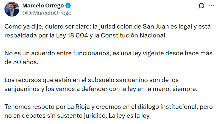 Por ejemplo, el gobernador Marcelo Orrego sostuvo en sus redes sociales: “Quiero ser claro: la jurisdicción de San Juan es legal y está respaldada por la Ley 18.004 y la Constitución Nacional. No es un acuerdo entre funcionarios, es una ley vigente desde hace más de 50 años. Los recursos que están en el subsuelo sanjuanino son de los sanjuaninos y los vamos a defender con la ley en la mano, siempre. Tenemos respeto por La Rioja y creemos en el diálogo institucional, pero no en debates sin sustento jurídico. La ley es la ley”.