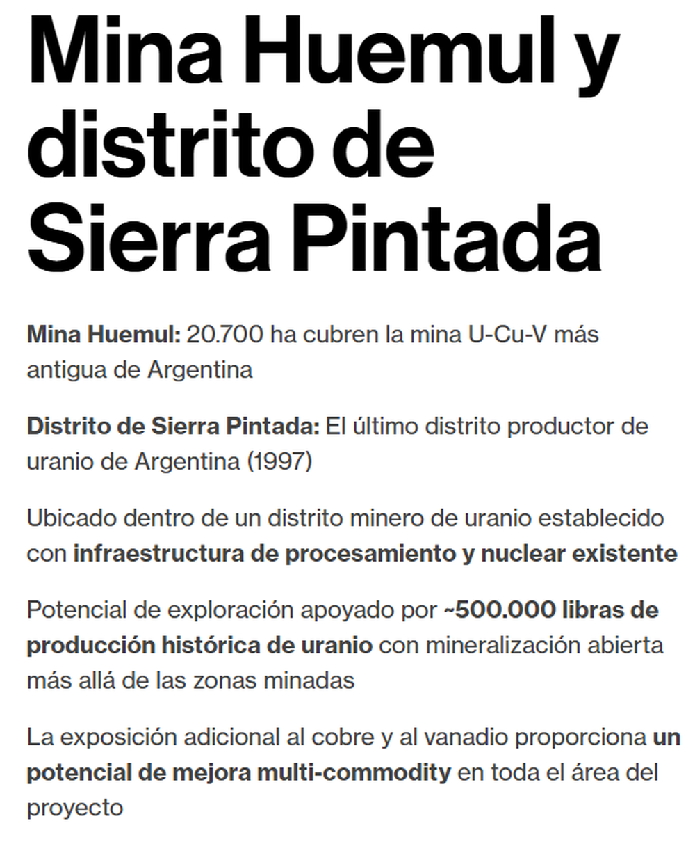 Desde la empresa consideran que Huemul encaja dentro de ese esquema, ya que concentra tres minerales clave (uranio, cobre y vanadio) en un mismo distrito y cuenta con antecedentes productivos, lo que reduce riesgos frente a proyectos en etapa inicial.