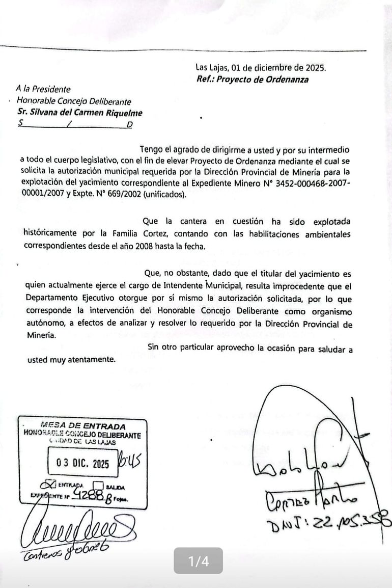 Según consta en la denuncia, mediante nota de fecha 01/12/2025, el intendente Pablo Cortez elevó a la presidencia del Concejo Deliberante de Las Lajas un proyecto de ordenanza. En dicha nota solicitó a ese cuerpo deliberativo la autorización municipal requerida por la Dirección Provincial de Minería para la explotación de un yacimiento correspondiente al Expediente minero N° 3452-000468-2007-00001/2007 y Expediente N° 669/2002, unificados.