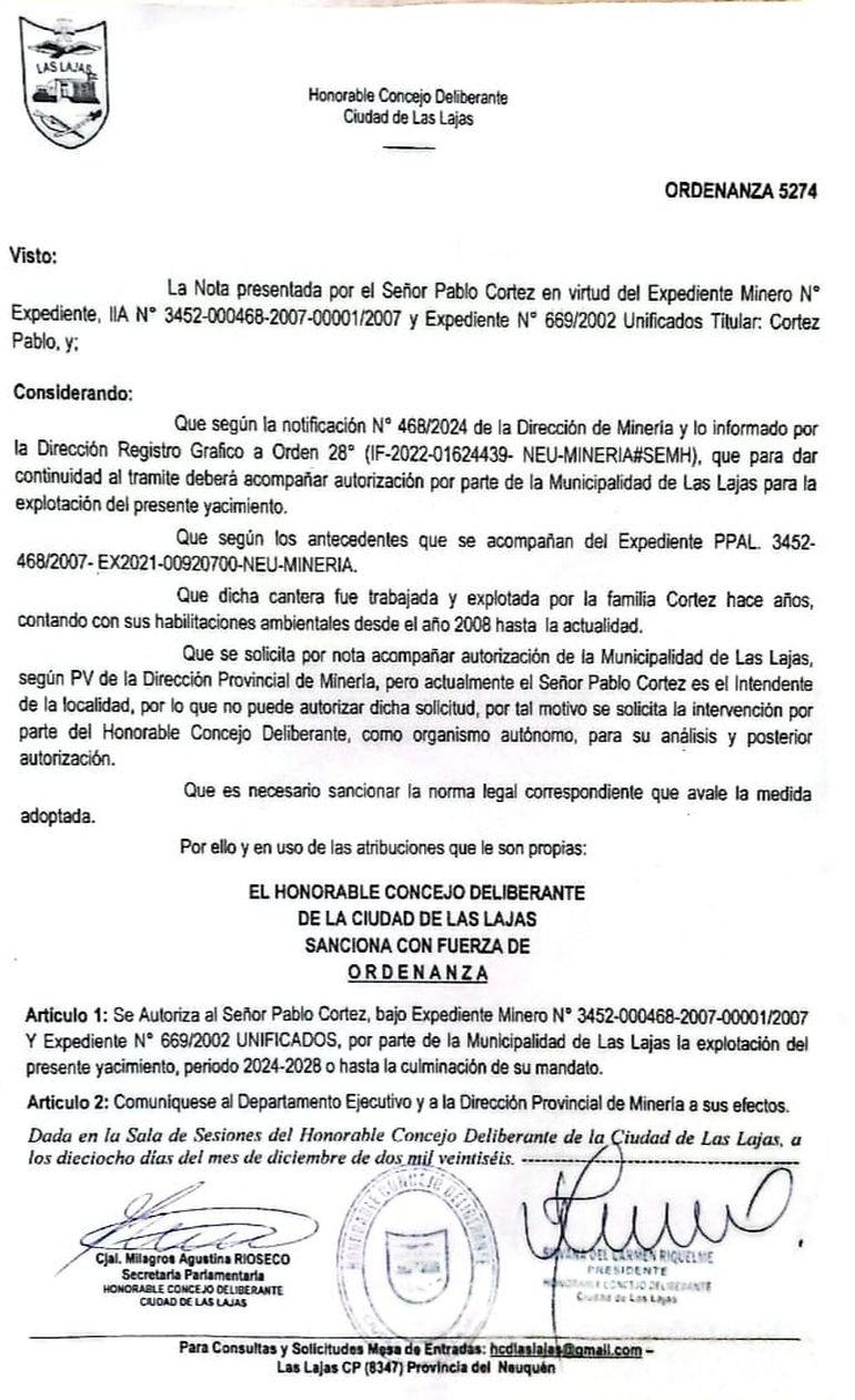Posteriormente, se sancionó la Ordenanza N° 5274 de fecha 18/12/2025, mediante la cual se otorgó autorización por parte de la Municipalidad de Las Lajas a la explotación del yacimiento minero en cuestión por el período 2024-2028, con carácter retroactivo.