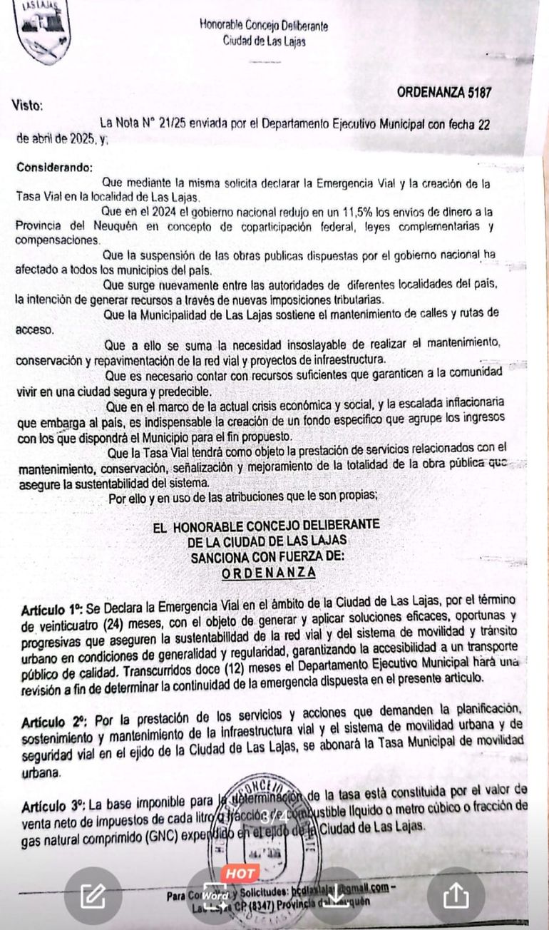 El segundo hecho denunciado se refiere a la Ordenanza N° 5187, impulsada por el intendente Pablo Cortez, mediante la cual el Concejo Deliberante de Las Lajas declaró la Emergencia Vial en el ámbito de la ciudad por el término de 24 meses.